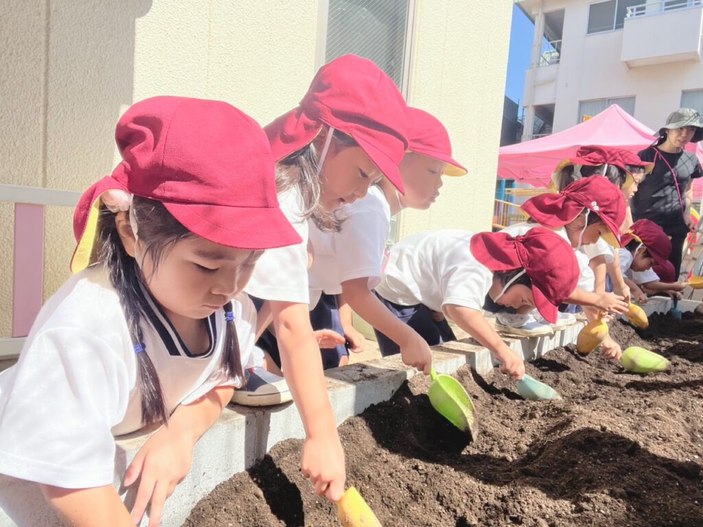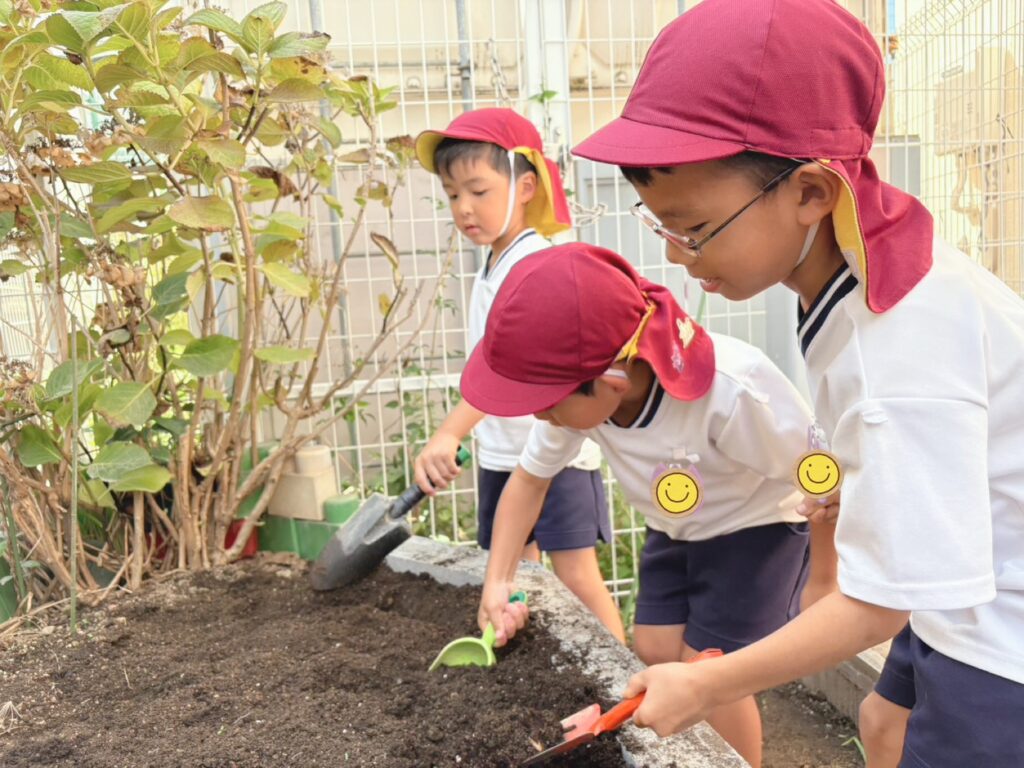 幼稚園に畑ができました。子どもたちはさっそく土を混ぜて畝を作ります。