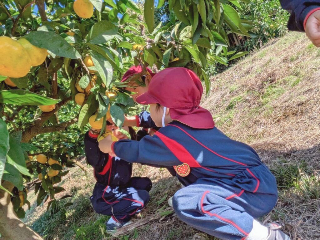 先日、秋の遠足に行きました。この日は縦割り活動である『にこにこ活動』のグループで回りました。異年齢のペアになってみかん山を回ります。「あっちの木のみかんがおいしいよ」「緑色より黄色の方が甘いんだよ」と教え合いながら楽しんでいました。年少組のお友だちの分をとってあげたり、お兄さんお姉さんになってお世話する姿も見られました。