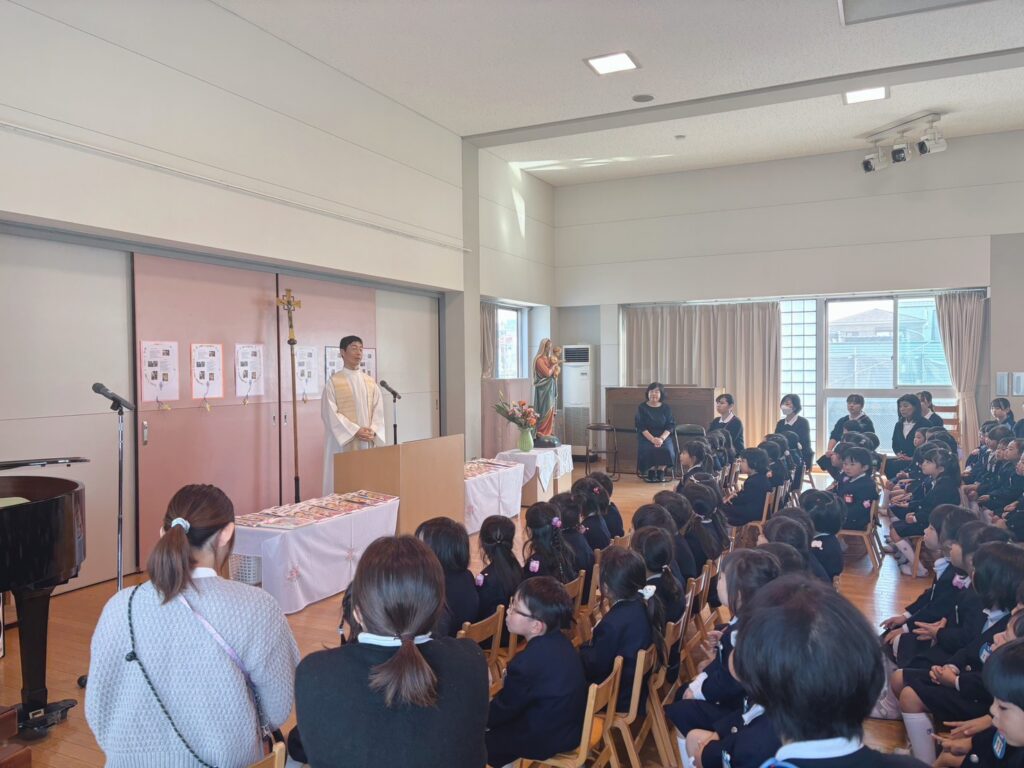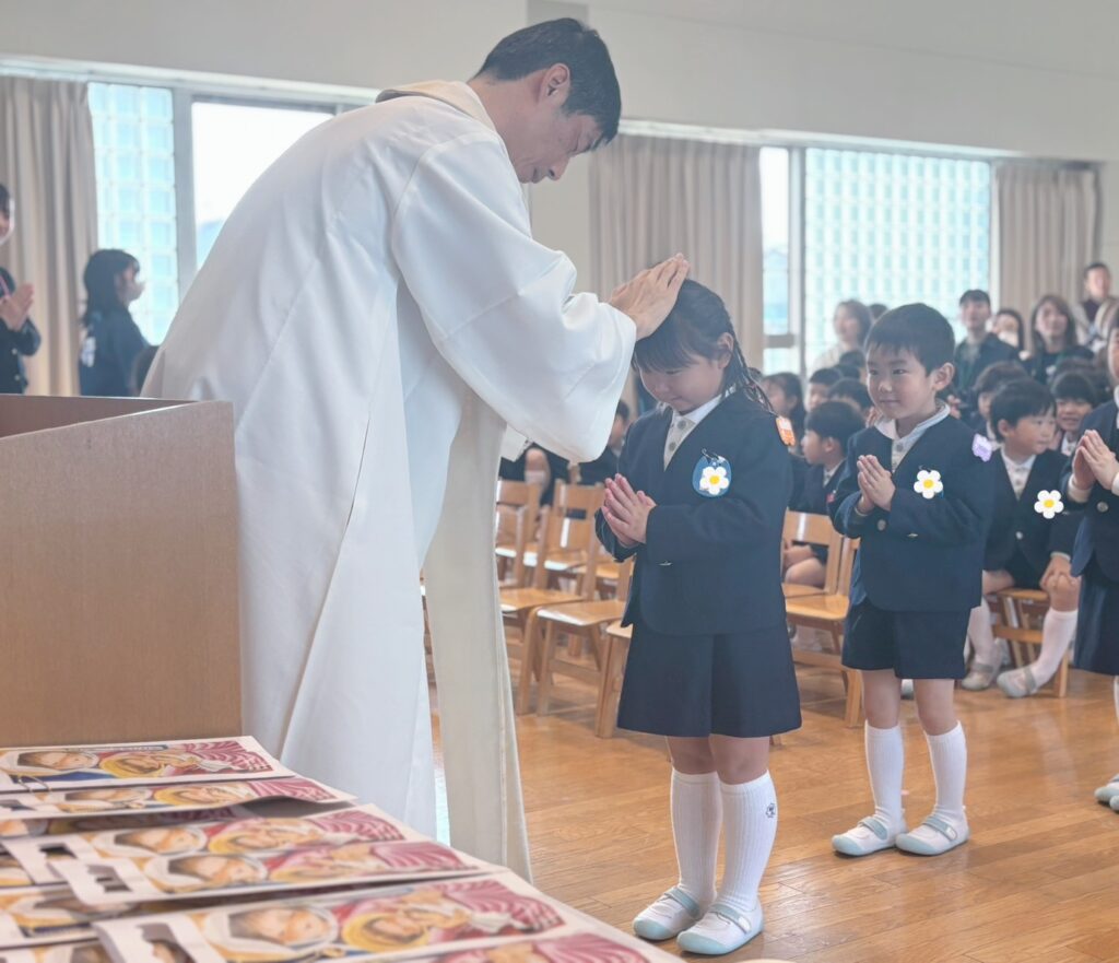先日、七五三のお祝い会を行いました。大久保神父様が司式をしてくださいました。「大きくなるのは身体だけじゃなくて、心も大きくなっているんだよ」とお話してくださいました。祝別していただいた千歳飴とおメダイをいただきました。これからもすくすくと成長してね。職員一同お祈りしています。
