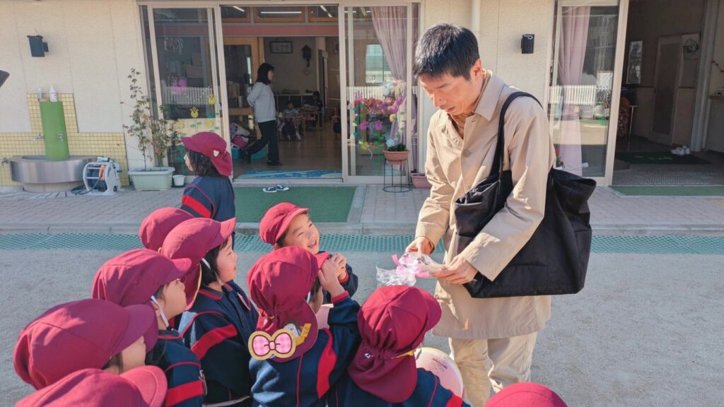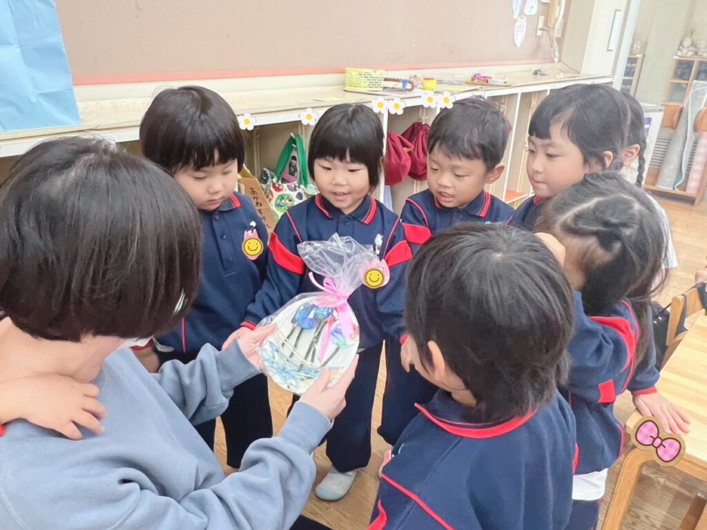 年中組・年少組は園内で給食を届けてくださる方や牛乳屋さん、神父様や先生に感謝の気持ちを伝えました。