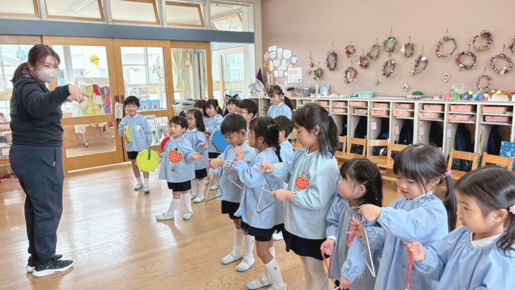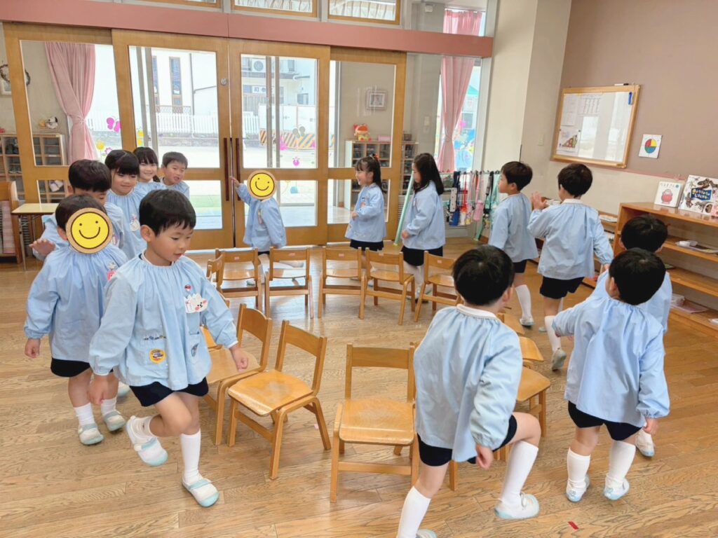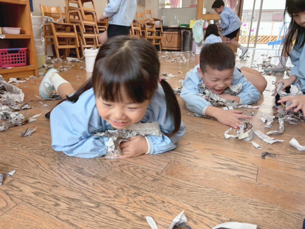 全員椅子取りゲームや新聞紙遊び、楽器遊びなどを行いました。異年齢のお友だちと楽しい思い出がまた増えたね。