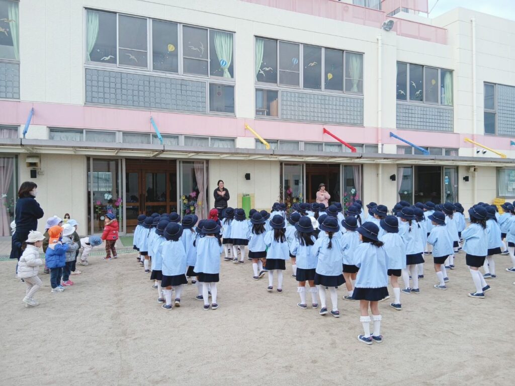 毎週金曜日に園庭に出て、全園児で体操をします。