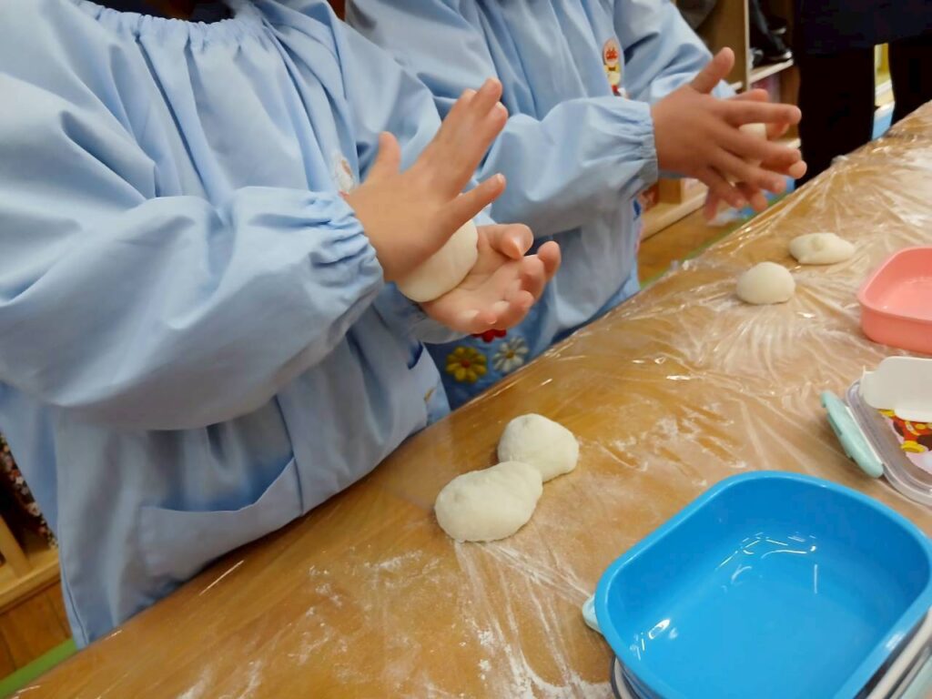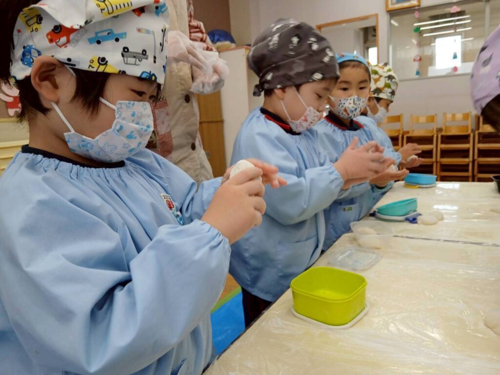 やわらかくてあたたかいお餅を小さな手で大切に丸めていきます。