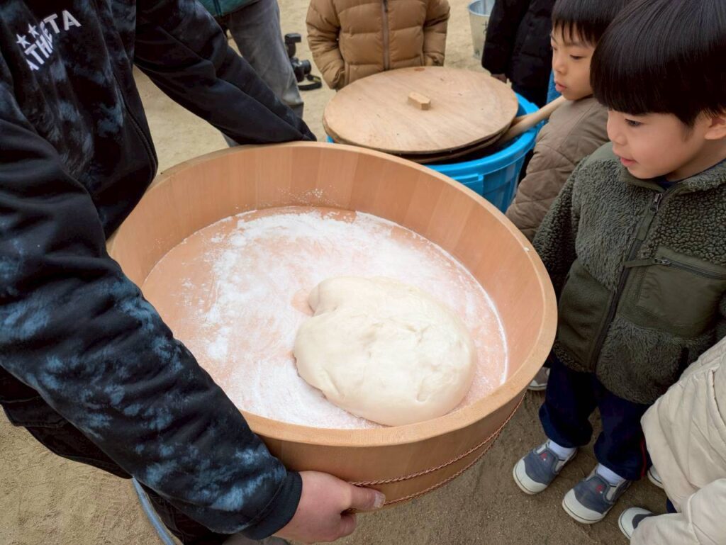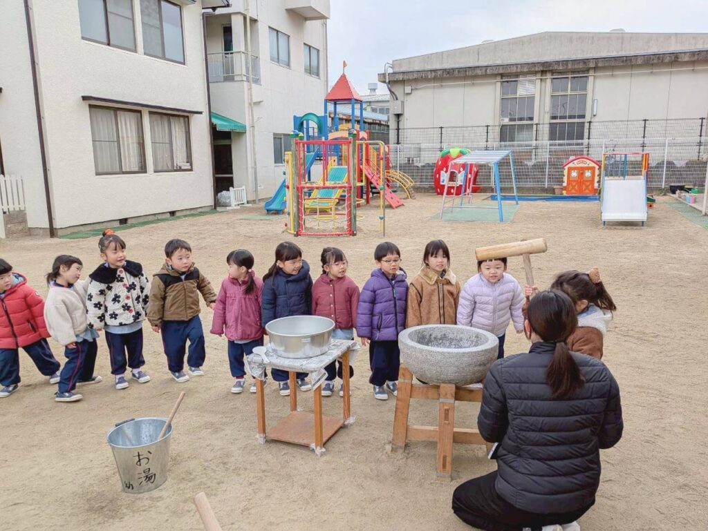 先日、幼稚園の園庭にておもちつきを行いました。子どもたちはお餅つきが大好き!この日をとても楽しみにしていました。