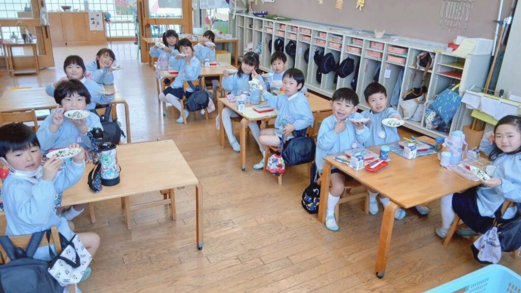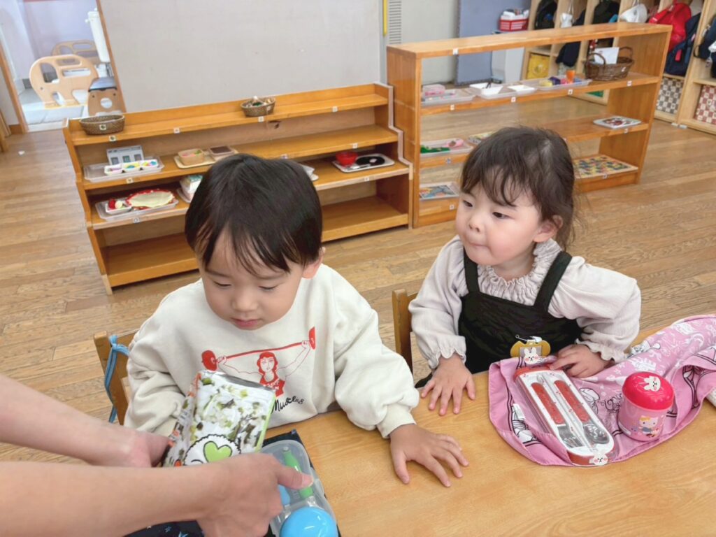 先日行った避難訓練の中で、非常食を食べる経験をしました。子どもたちは非常食に興味津々!「これがごはんになるの?」「どうやって?」と不思議そうにのぞき込みます。