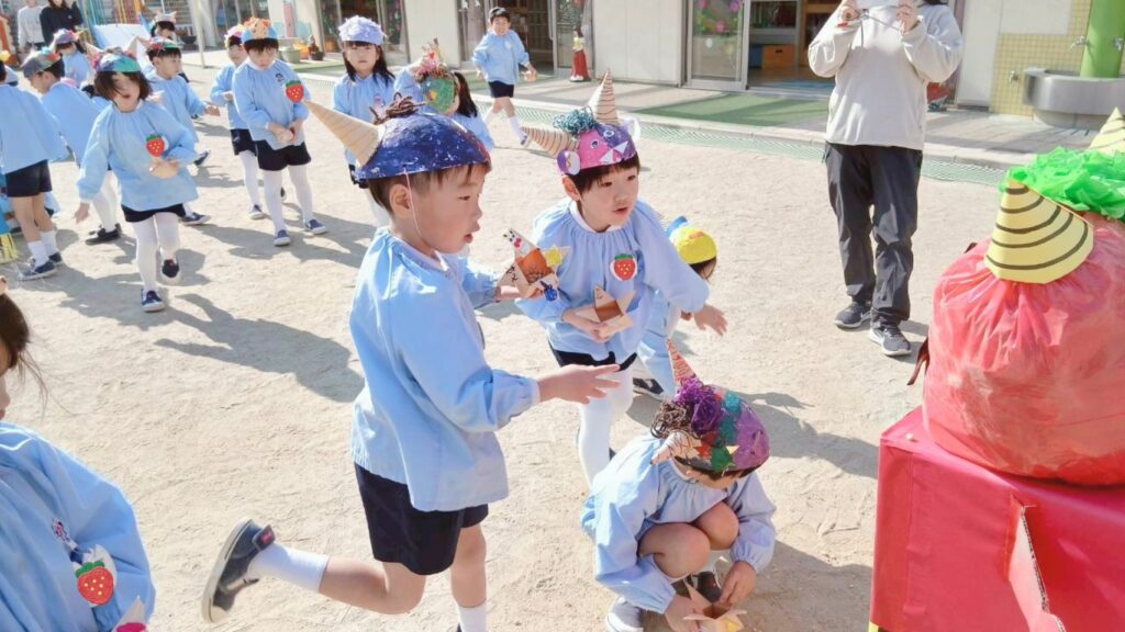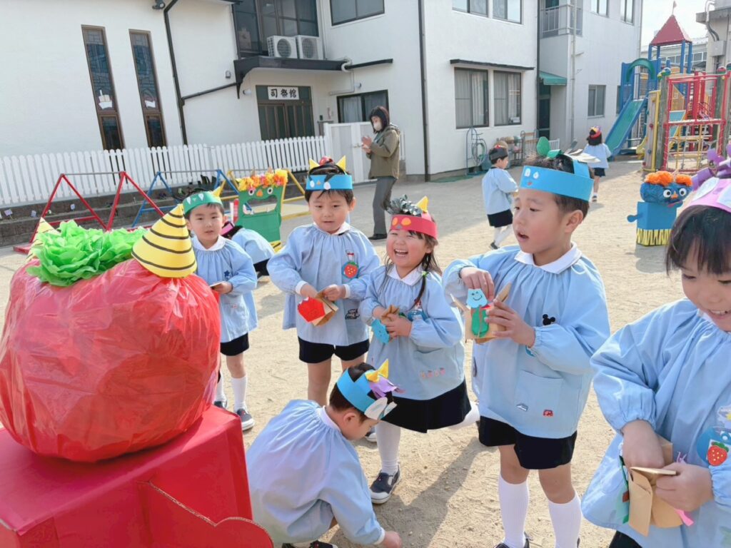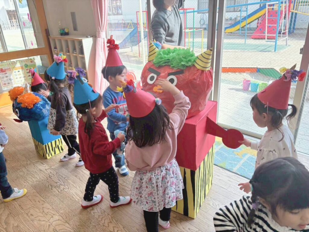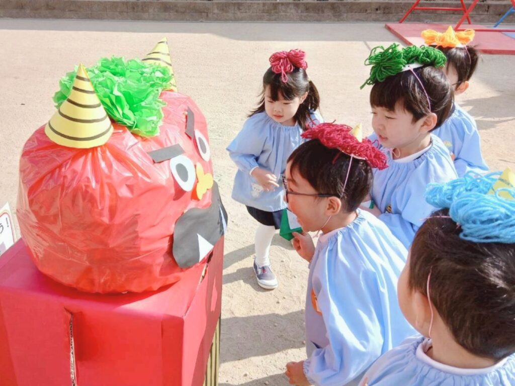 先日、幼稚園でも豆まきを行いました。この日のために、子どもたちは節分の由来を聞いてお面や豆入れのお製作に取り組んでいました。当日は、自分で作った自慢のお面をつけて豆まきを楽しんでいました。