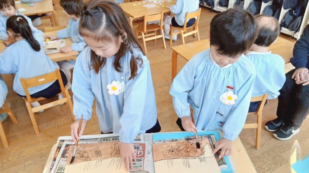 年長組は育てたお米の絵を描きました。土づくりから始め、田植えをして水やりや稲刈り、精米などたくさんの経験を思い出しながら会話も弾みます。