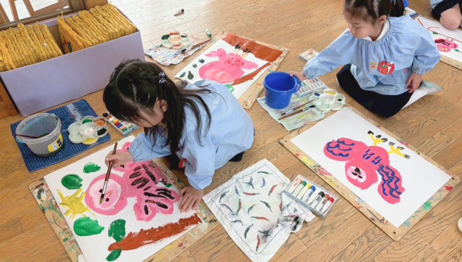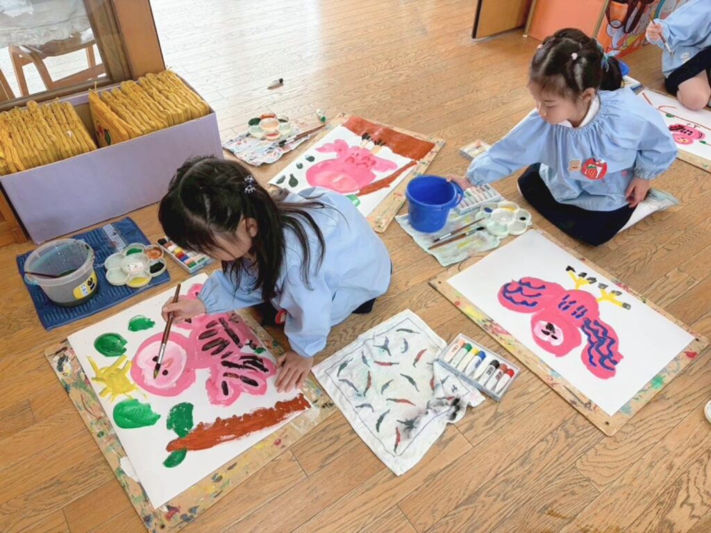 集中して、丁寧に仕上げた絵は子どもたちにとって自慢の作品になりました。「見て!あれ私が描いたんだよ!」とたくさんのお友だちが教えてくれました。