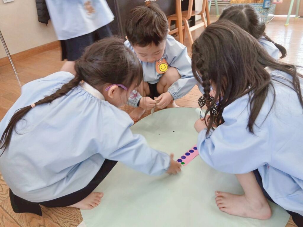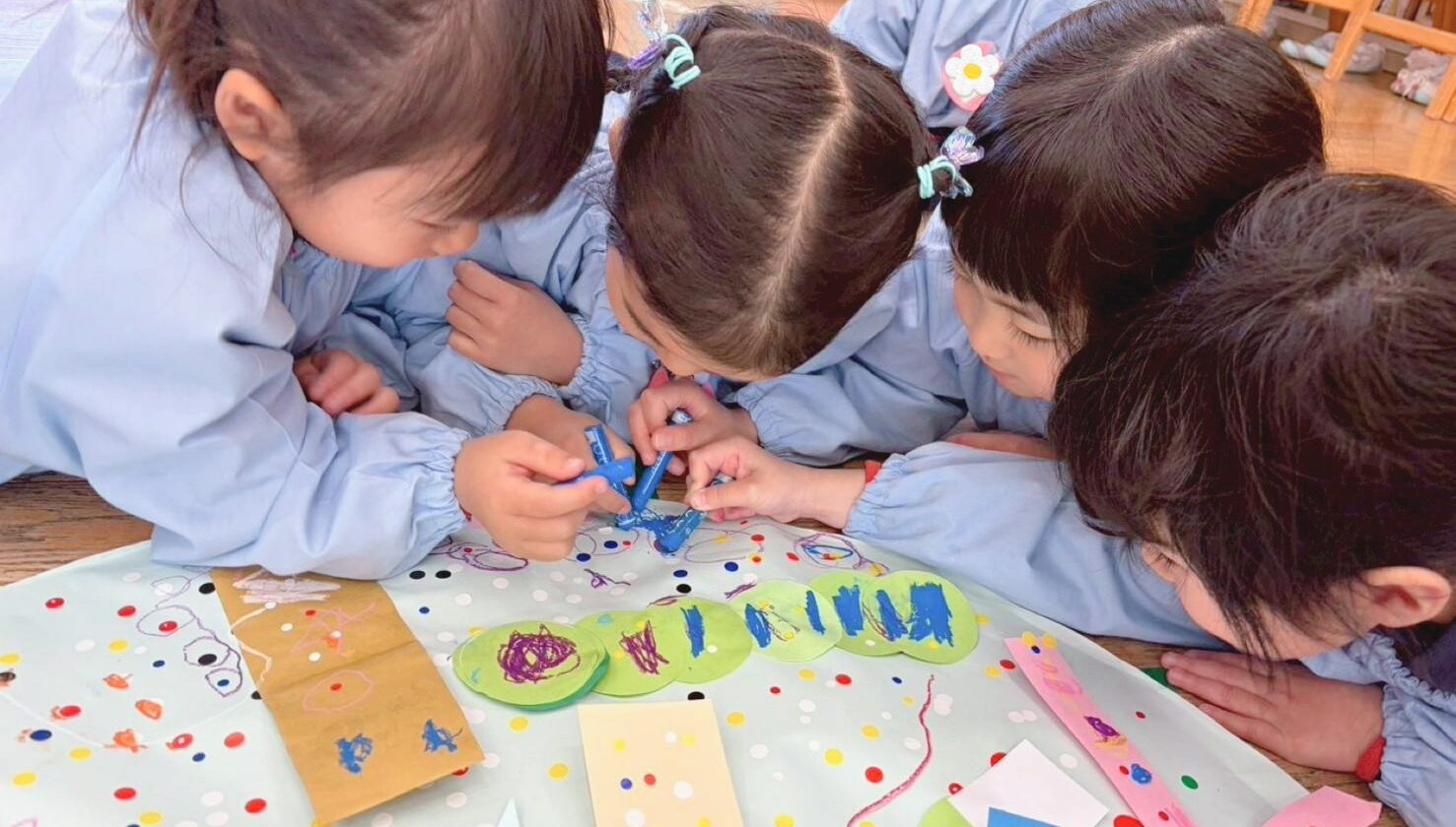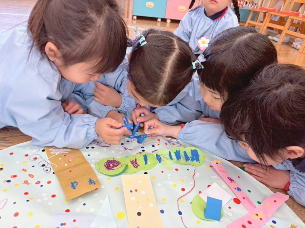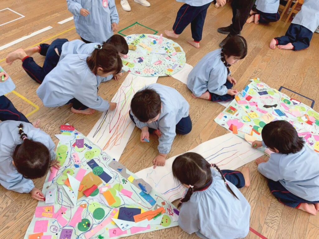 年少組も共同画に挑戦です。お友だちの様子もしっかり見ながら思い思いの表現を楽しんでいました。