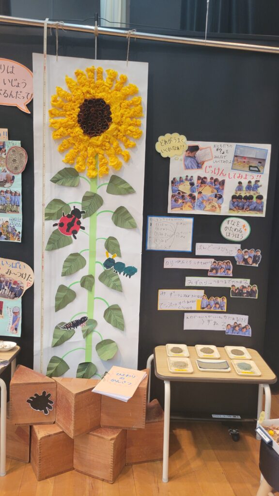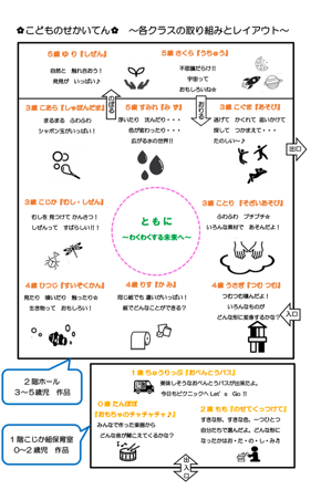 子どもたちの「知りたい。」という気持ちを大切にしながら各クラスでテーマを決めて取り組んでいる保育。私たちは子どもたちが、今まで通り一人ひとりが身につけなければならないことを身に着け、その上でどうすれば自分の好きなことを見つけたり、そのことに主体的に取り組んでいくことができるかを考えながら保育を進めています。こどものせかい展ではそんな日々のクラスの様子をご家族の方に見ていただきました。当日は嬉しそうに自分たちの知っていることを誇らしげにご家族の方に話している姿が印象的でした。子どもたちに自分たちの学びが世界を変えていく力があることに気づいてほしいと思っています。