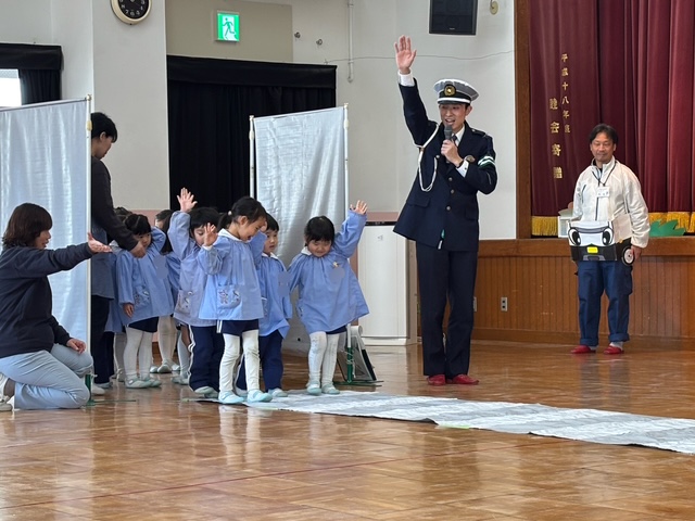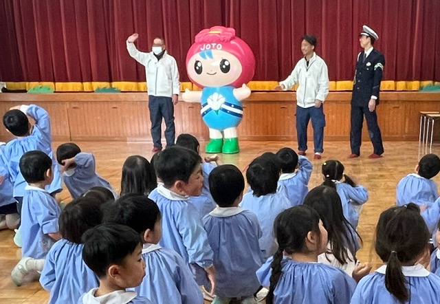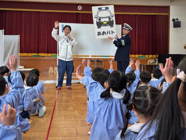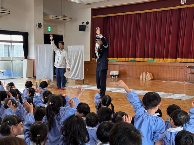 『交通安全教室』を行いました。城東警察署のおまわりさんと区役所の方と一緒に、交通ルールのおべんきょうです♪♪子どもたちは交通ルールをよく知っているようで、いろいろな質問にはりきって応えていましたよ。