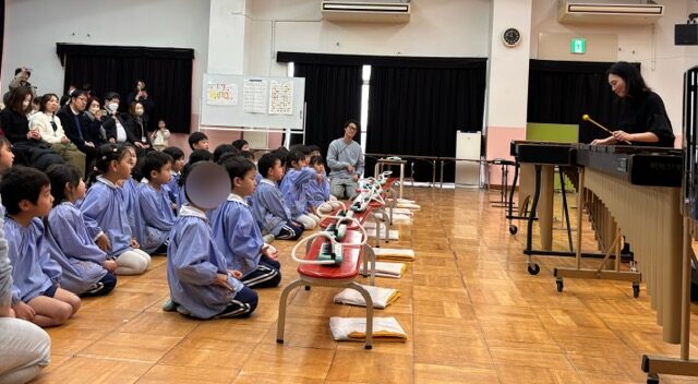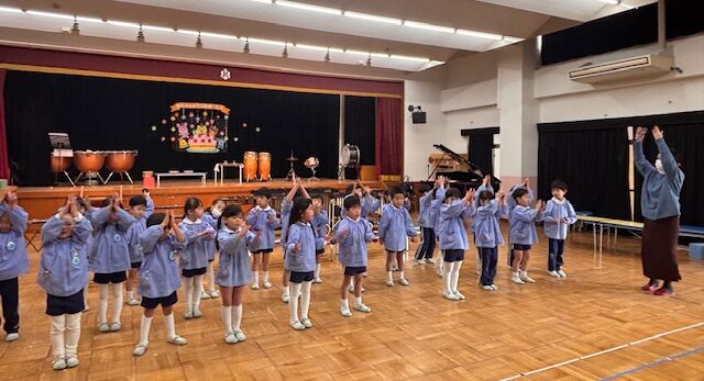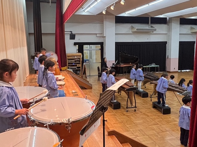 いよいよ、参観当日。大太鼓をたたくお友だちの音を聞いて、みんながリズムを合わせていきました。緊張している子どもたちでしたが、その緊張が速くなったり、ゆっくりになったりとリズムを作り、素敵な合奏を保護者の方に届けることができました♪